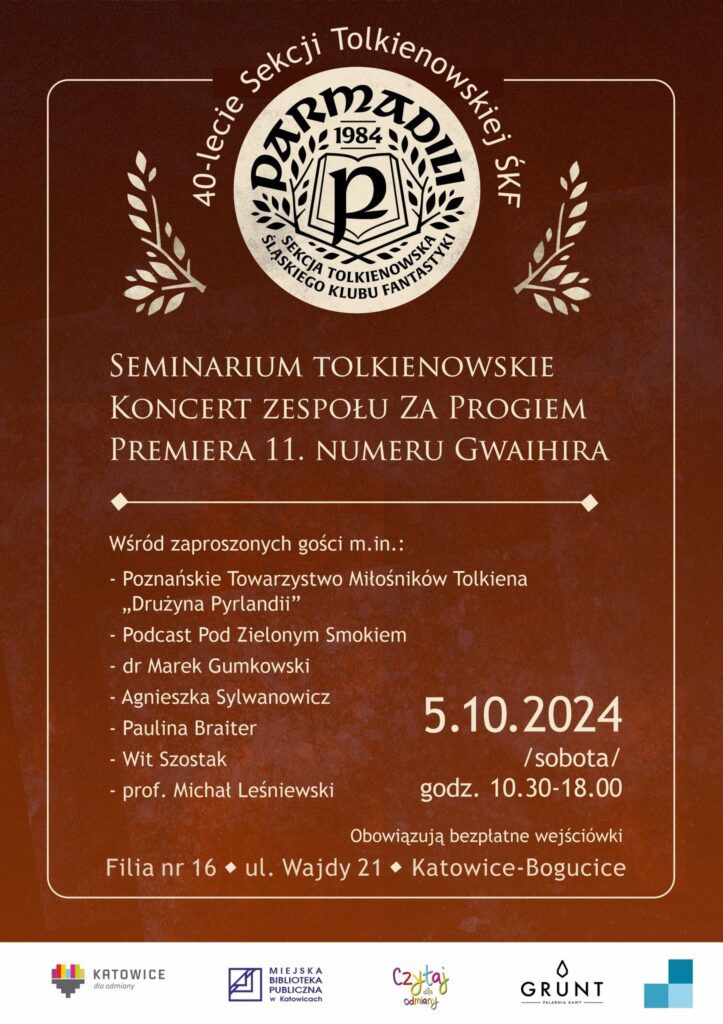 Sekcja Tolkienowska ŚKF – Parmadili przedstawiła program obchodzonego za tydzień Czterdziestolecie Sekcji Tolkienowskiej ŚKF, na którym i ja będę miał przyjemność współprowadzić jeden z punktów: