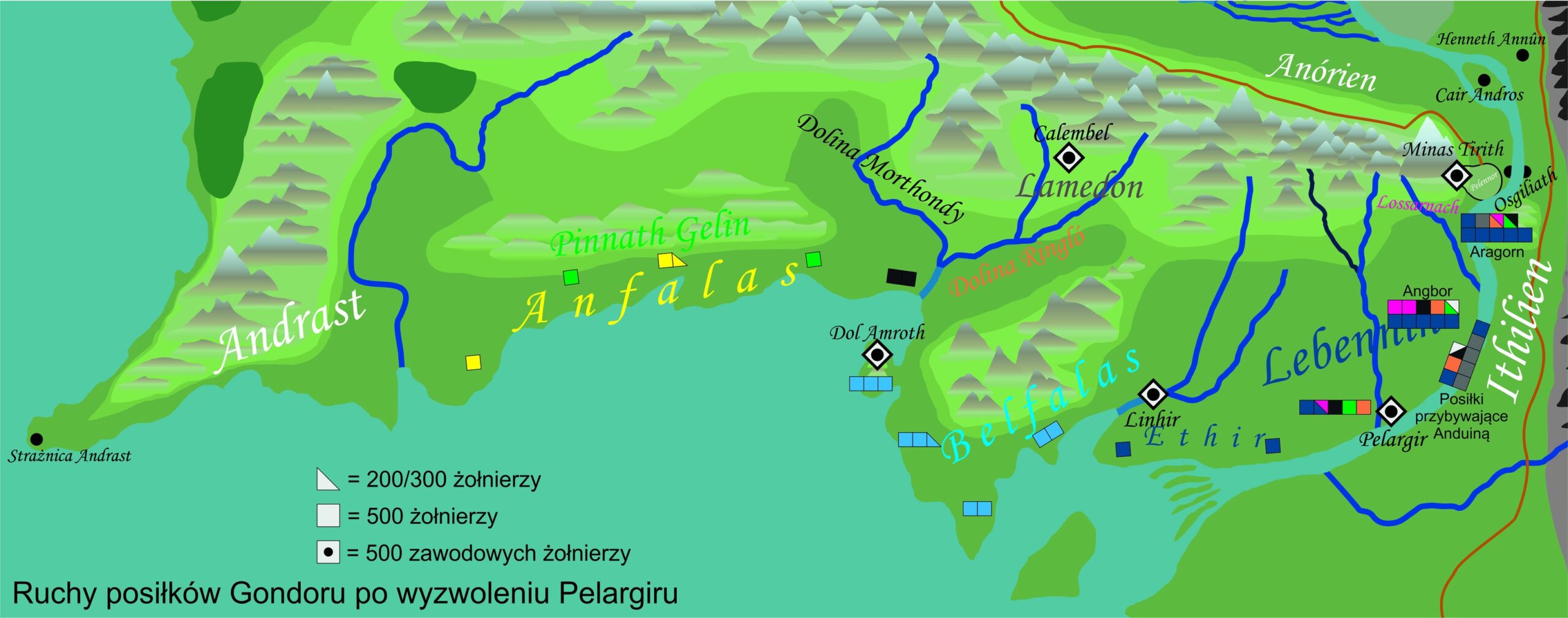 Brakuje więc reszty sił Belfalas, Anfalas, Doliny Ringlo i Doliny Morthondy oraz Pinnath Gellin. Gdzie mogły znajdować się te wojska? Z jednej strony dowiadujemy się, że te krainy również wysłały przed oblężeniem zdecydowanie mniejsze siły niż oczekiwano i że jakaś część dopiero później przybyła pod Minas Tirith. Z drugiej strony wiemy, że Aragorn zbiera w Pelargirze przede wszystkim ludzi z Lebenninu oraz Lamedonu i to w wielkiej liczbie.