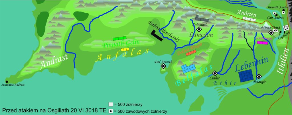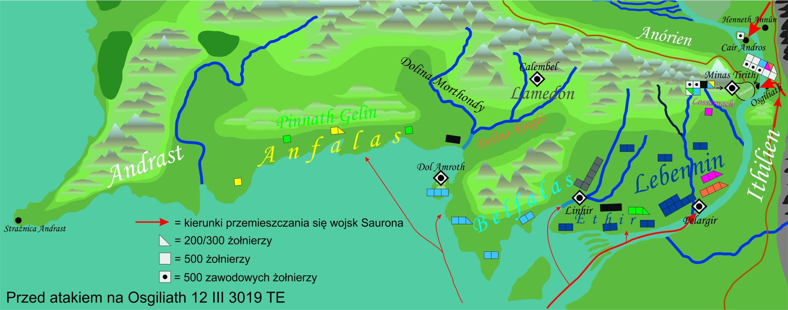 Założyłem, że około ⅗ obrońców zaangażowanych było w walki o Osgiliath i forty na grobli. Faramir wyruszył w przeddzień szturmu z posiłkami, które wsparły pozycje Gondoru nad Anduiną: