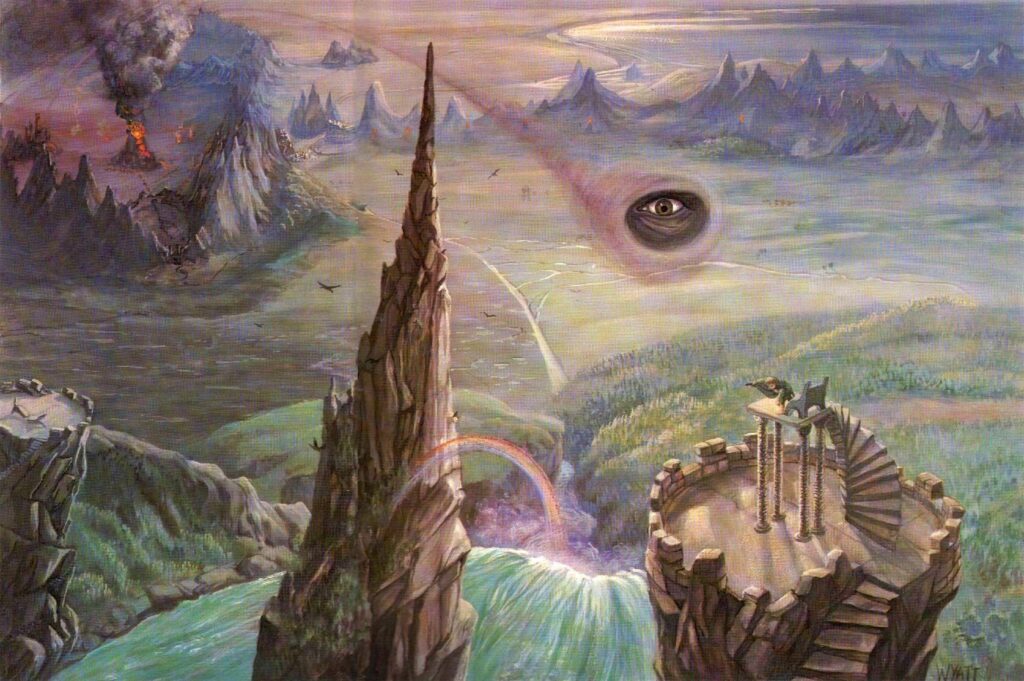 Nagle wyczuł obecność Oka. Tam w Czarnej Wieży, czuwało bezsenne i już świadome, że Frodo je widzi. Skupiała się na nim potężna wola. Skierowało się w stronę Hobbita jak wyciągnięty palec, szukając ofiary. Jeszcze chwila, a znajdzie Froda, przygwoździ go do miejsca. Musnęło szczyt Amon Lhaw. Dotknęło szczytu Tol Brandir…”