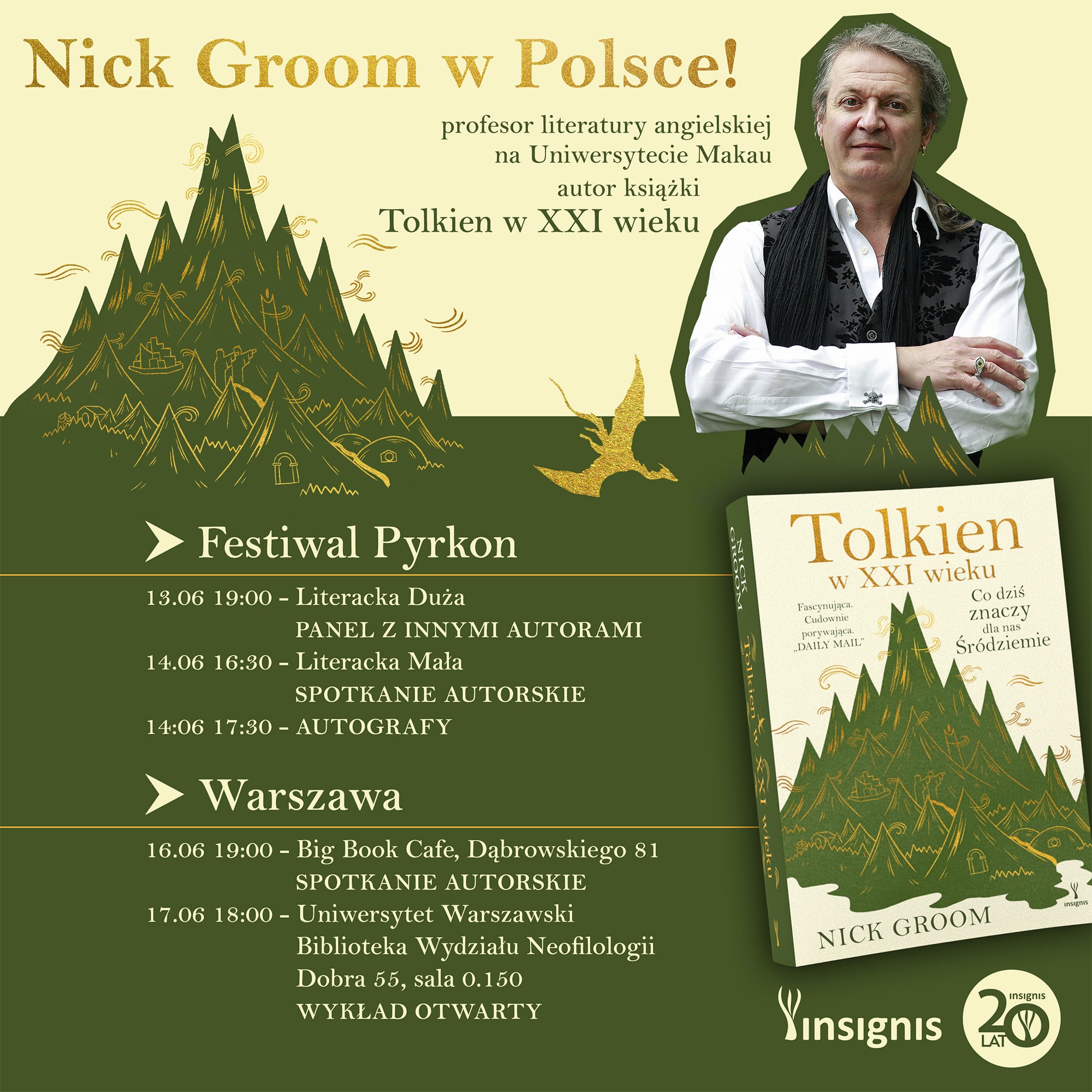 Mamy przyjemność zaprosić na organizowane we współpracy z Uniwersytetem Warszawskim wykład otwarty oraz spotkanie autorskie z Nickiem Groomem, profesorem literatury angielskiej oraz autorem świeżo wydanej po polsku książki „Tolkien w XXI wieku. Co dziś znaczy dla nas Śródziemie”, oprócz samego Tolkiena poświęconej przede wszystkim jego recepcji we współczesnej kulturze.